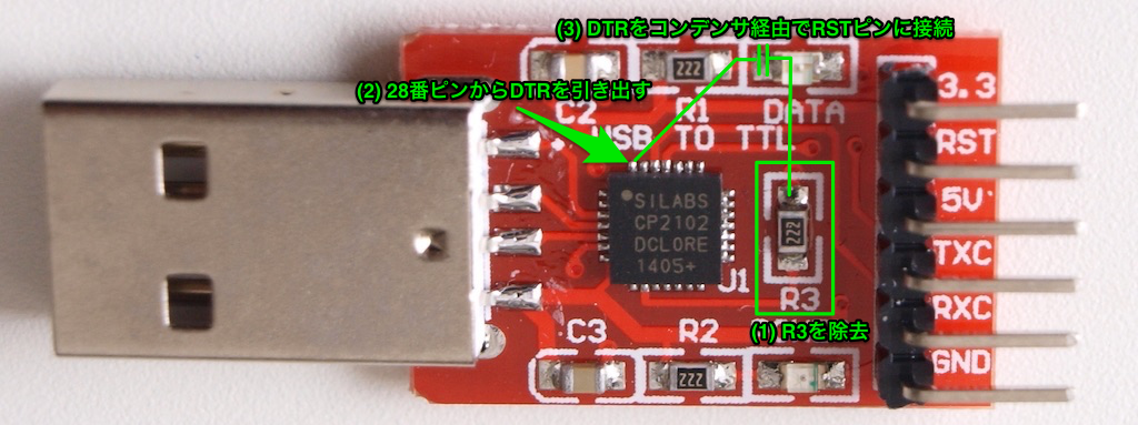 最初はRST用のピンヘッダから9番ピン(RST)へ繋がっているパターンをカットするつもりだったのですが、途中に抵抗R3がハンダ付けされていたので、こいつを外してパターンカットの代わりとして、さらに空いたランドに積層セラミックコンデンサを取り付けました。